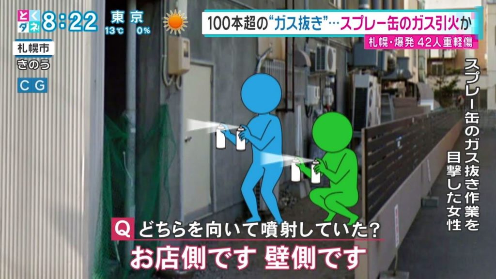 札幌市豊平区の建物爆発では、200メートル以上離れたマンションの窓ガラスが爆風で割れるなど被害は広範囲に及んだ。専門家は衝撃波を伴った「爆轟(ばくごう)」という現象が発生した可能性を指摘。爆発が大規模になったことについては、不動産仲介業者店舗内で、除菌消臭用スプレー缶の可燃性ガスが大量に噴射されたことに加え、店舗内部に階段がなく気密性が高くガスがたまりやすい構造だったことなど、複数の要因が重なったとみる。