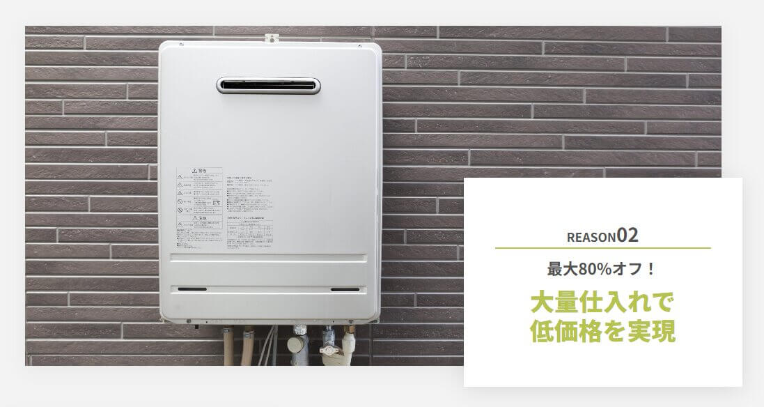 メーカーから商品を直接、大量に一括で仕入れるので、一般に出回っている価格より安価に手に入れられます。そのため、交換する給湯器の種類によっては最大80%オフと、破格の金額で提供できるのです。