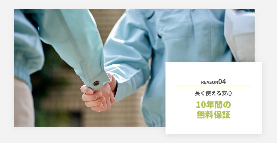工事後、10年間無料で保証がついている点、安く早く工事をしてくれる点は、万が一施工不良が発生しても安心材料になりますし、家計にも優しいです。
