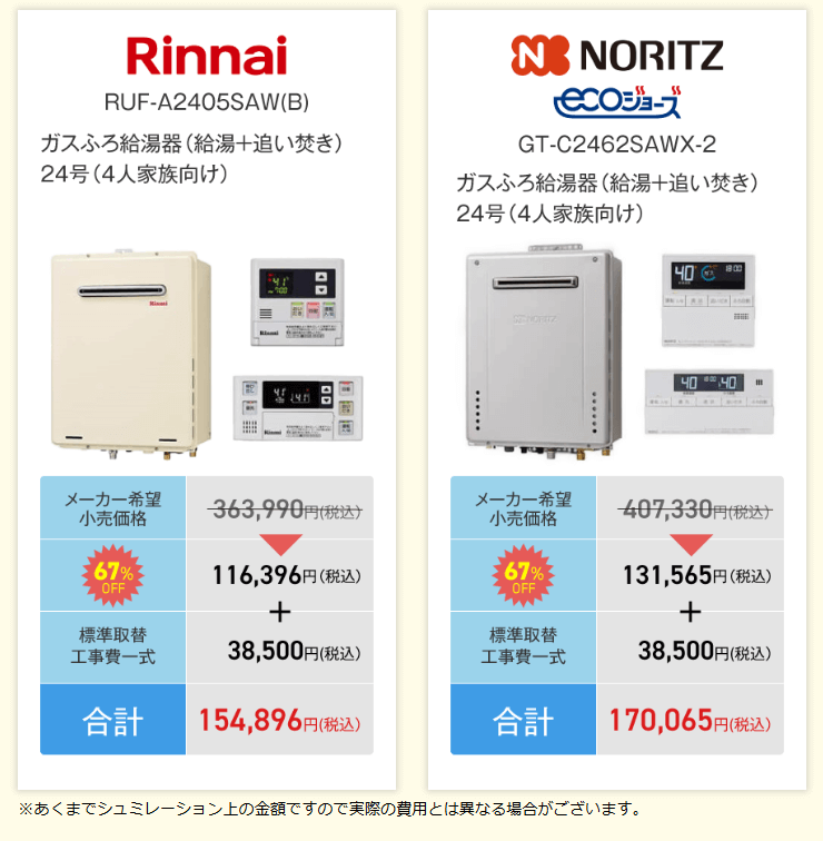 それでは実際に、給湯パンダで給湯器の交換工事を依頼するとどのくらいの金額がかかるのでしょうか。具体的に、給湯パンダがおすすめしている2種類を紹介しますので、ご参考ください。