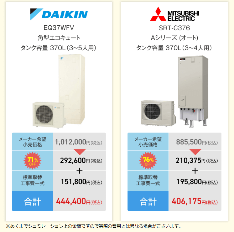 | ダイキン | EQ37WFV | 角型エコキュート/370L | 総額 444,400円(税込) |