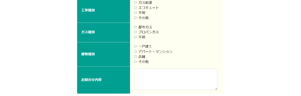 続いて、工事希望の商品の選択、ガスの種類、建物の種別を入力します。必要に応じて、一番最後のお問い合わせ内容を入力します。