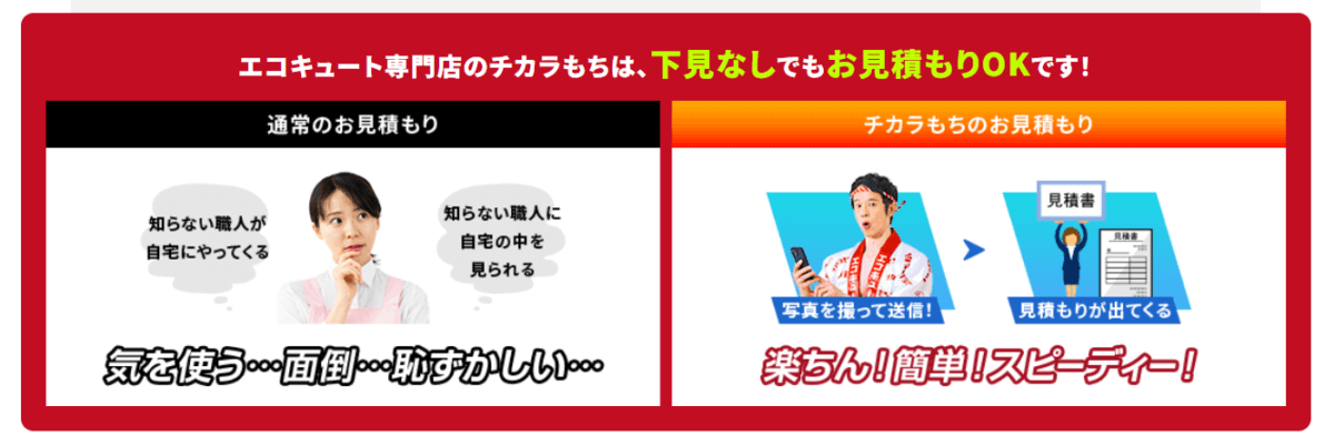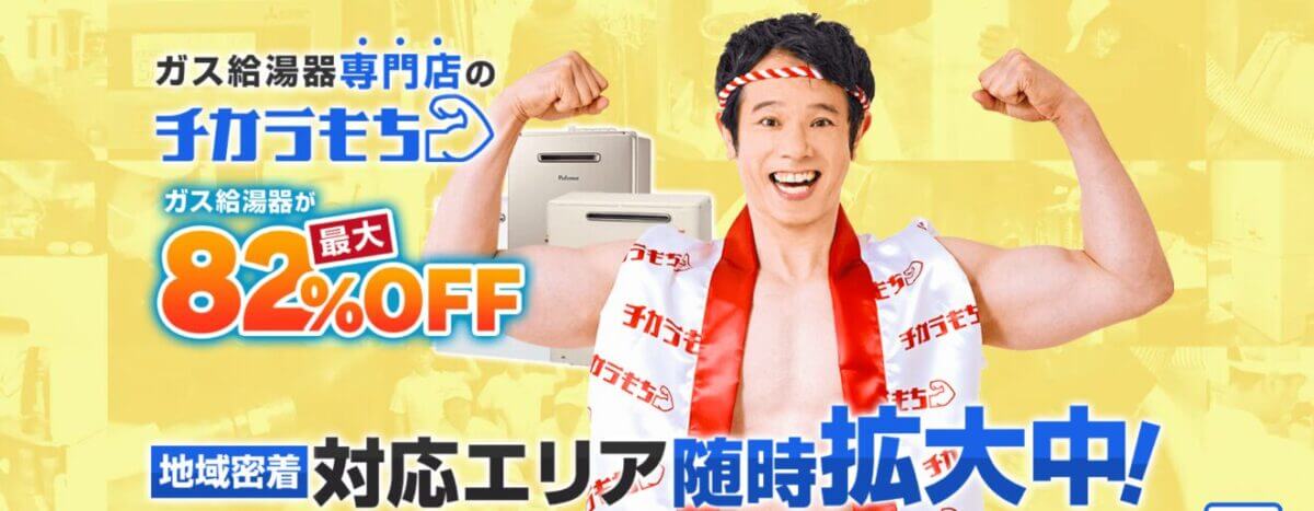 チカラもちは「ガス給湯器が最大82%OFF」「自社職人スピード対応」をキャッチフレーズにして活動しています。チカラもちとは、給湯器やエコキュートを迅速に安く交換してくれる施工会社になります。