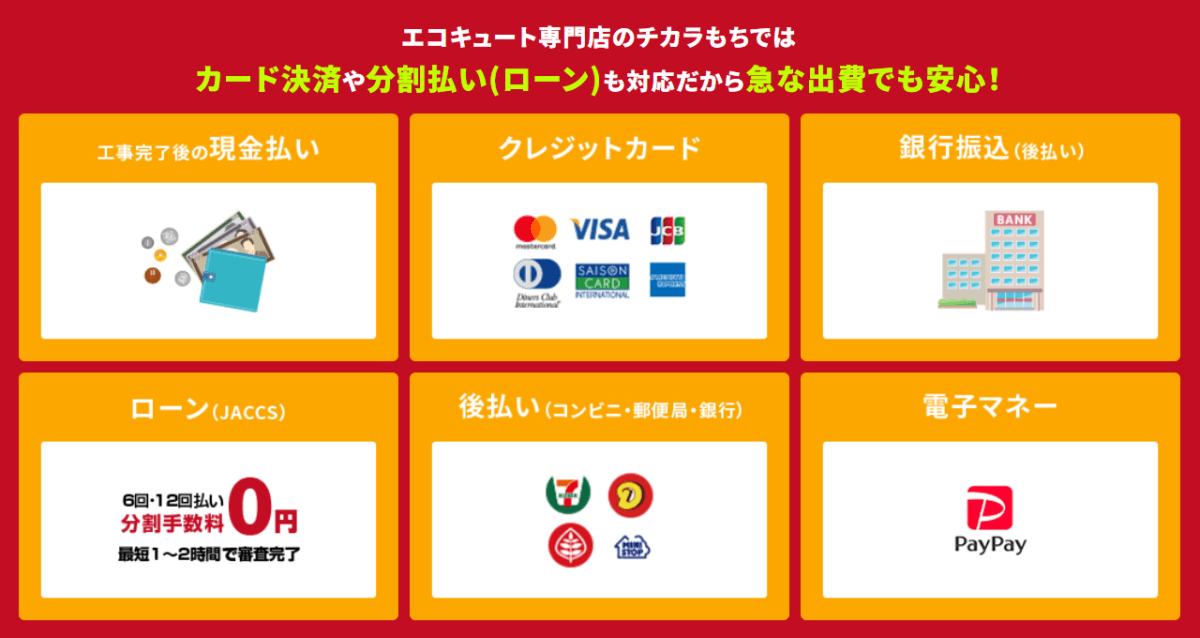 - チカラもちの支払い方法は現金、クレジットカード、銀行振込、リフォームローン、後払い(コンビニ・郵便局・銀行)、電子マネーでのお支払いが可能