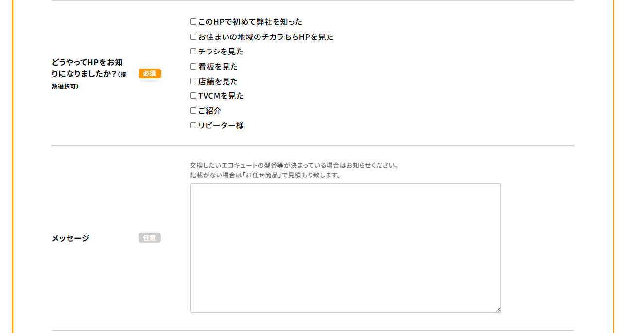 次に、HPを知った理由の選択と、メッセージの入力を行います。交換したい希望の商品がある場合はメッセージ欄に入力します。