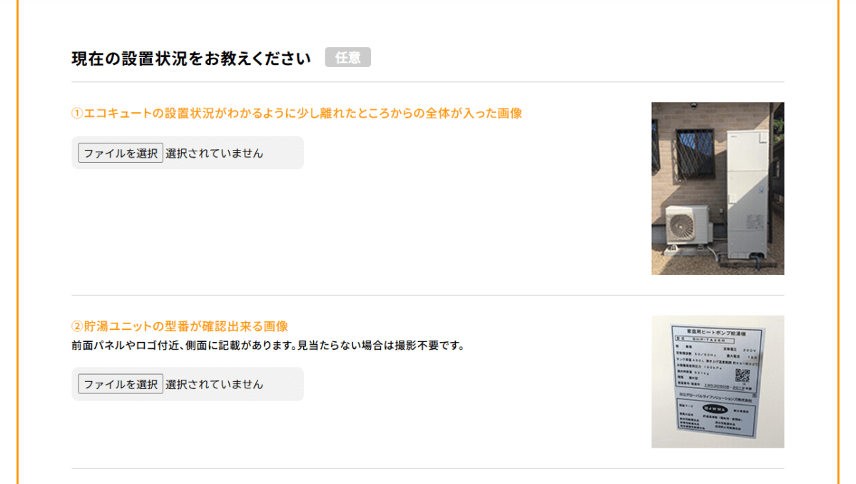 続いて、現在使用中のエコキュートの写真を送ります。添付は必須ではありませんが、より確実な見積りが欲しい場合や、取替希望の商品を相談したい場合などは極力、画像を送るのをおすすめします。