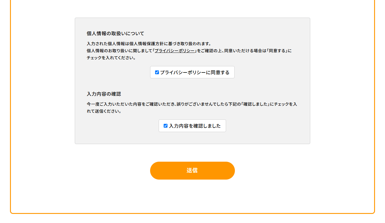 最後にプライバシーポリシーを確認した上で「プライバシーポリシーに同意する」、入力内容に誤りがないか確認後「入力内容を確認しました」のチェックボックスをクリックし、一番下のオレンジボタン「送信」をクリックし終了です。