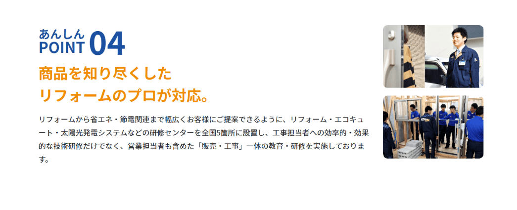 エディオンでは、施工担当者、営業担当者を対象に充実した研修を行っています。そのため、どの担当者にあたっても平等に安心安全なサービスを受けられます。
