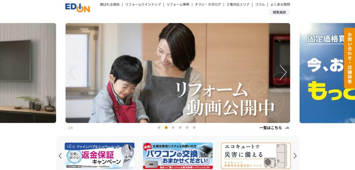 | 会社URL | ■公式サイト、運営団体https://reform.edion.jp/ ■公式ツイッターhttps://x.com/edion_PR?ref_src=twsrc%5Egoogle%7Ctwcamp%5Eserp%7Ctwgr%5Eauthor ■公式フェイスブックhttps://www.facebook.com/edion.jp/?locale=ja_JP ■公式インスタグラムhttps://www.instagram.com/official_edion/ ■公式ティックトックhttps://www.tiktok.com/@edion_pr?lang=ja-JP ■公式ユーチューブhttps://www.youtube.com/channel/UCJ8Mbwxh9XMfRc6WuiZQ5Gg |