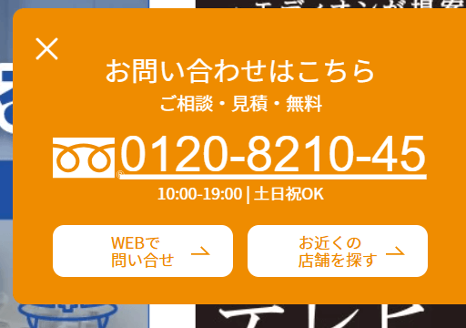 右側にあるオレンジ色のタブ「お問い合わせ・店舗検索」ボタンをクリックします。