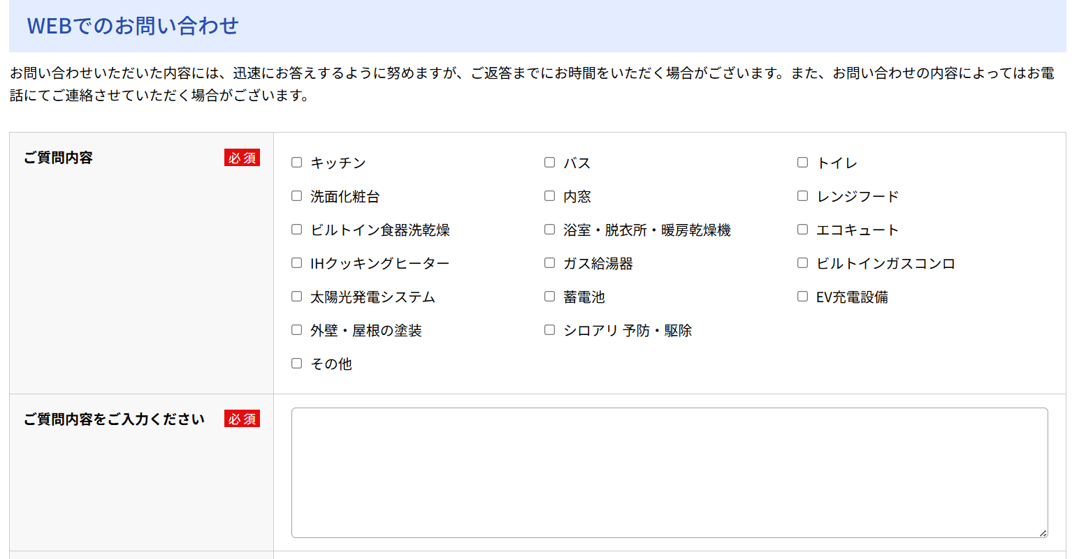 問い合わせ内容を選択します。給湯器の見積りを希望する場合は真ん中の上から4つ目、エコキュートの見積りを希望する場合は左端の上から3つ目のチェックボックスをクリックします。