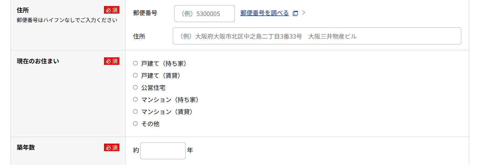 続いて、ご自身の名前、年齢、メールアドレス、電話番号、住所、家の種類、築年数を入力します。