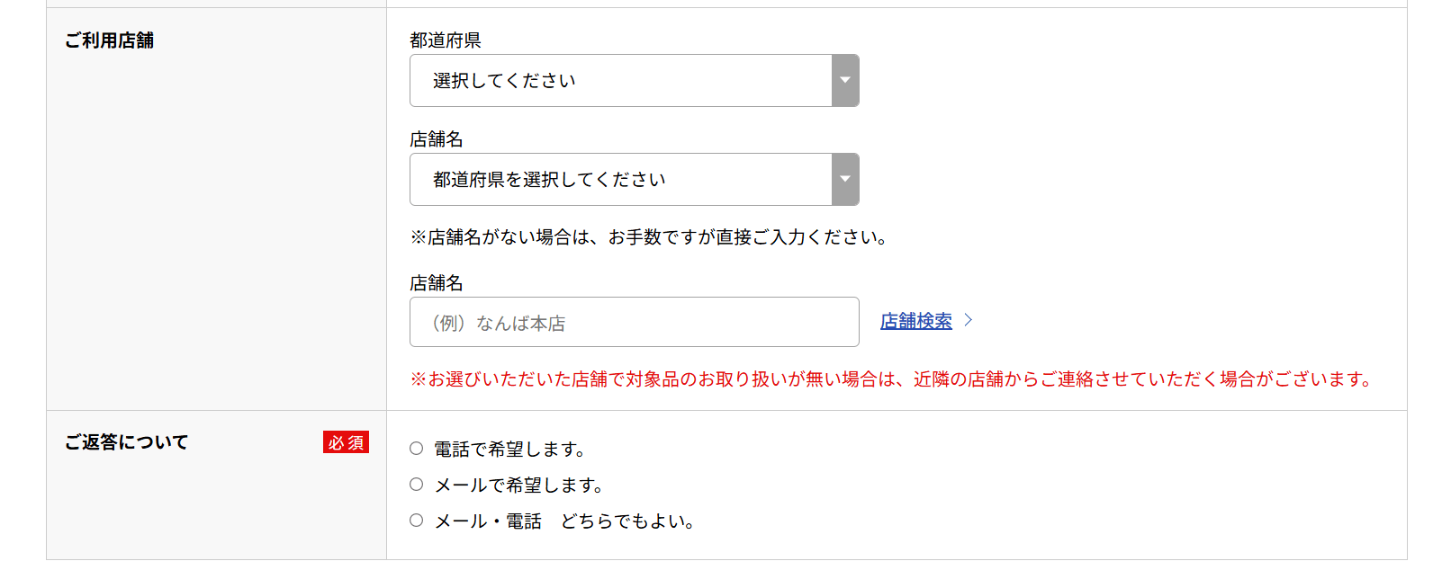 次に、普段利用している店舗がある場合は店舗名を入力し、返答方法を選択します。