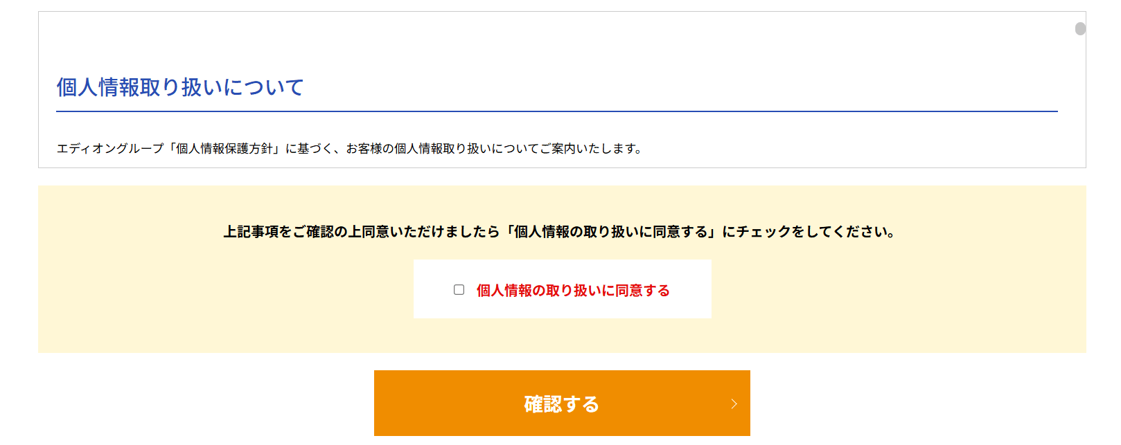 最後に個人情報の取り扱いについてを読み、「個人情報の取り扱いに同意する」のチェックボックスをクリックし、一番下のオレンジのボタン「確認する」をクリックします。