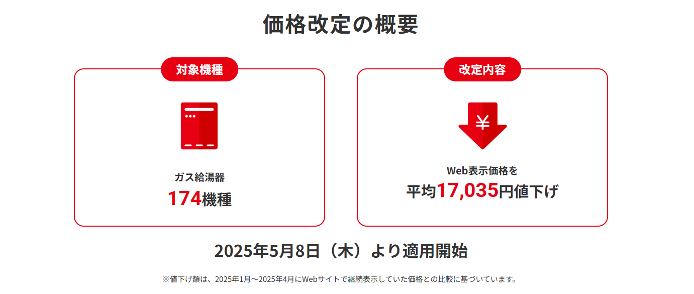 また、2025年5月からは「誰にとってもベストプライス」を掲げ、人気給湯器174機種を平均17,035円も値下げをしました。値切り交渉をしなくてもすべての人がお得に商品を購入できるようになったのは、この業界では非常に革新的な政策とも言えます。