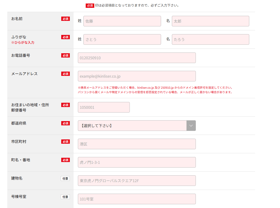連絡先を入力します。上から順に、名前、電話番号、メールアドレス、住所の入力を行います。