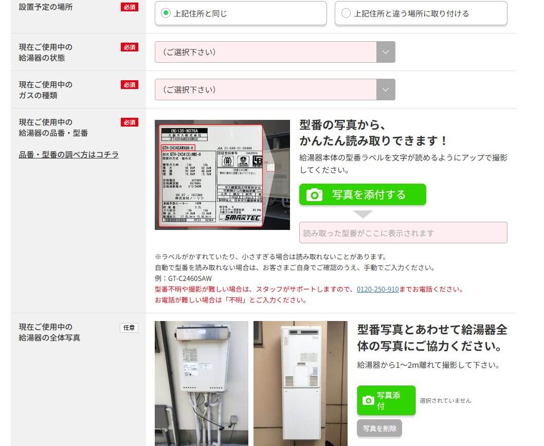 合わせて、給湯器の写真を添付します。型番が分かるアップの写真と、給湯器が設置されている全体の写真があると詳細な相談が可能になるので極力添付されるのをおすすめします。
