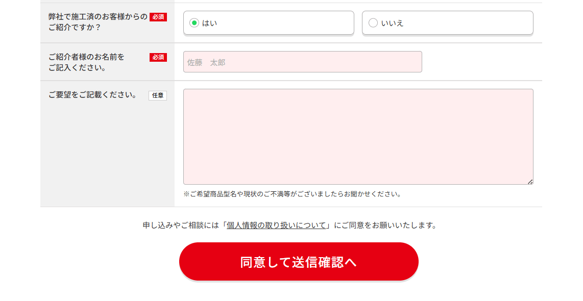 最後に人からの紹介でキンライサーへ依頼している場合は、「弊社で施工済のお客様からのご紹介ですか?」の項目を「はい」へ変更し、紹介者の名前を入力します。