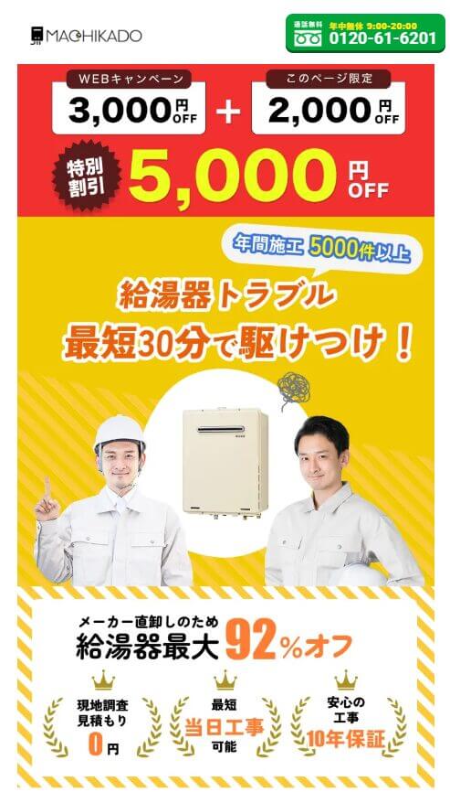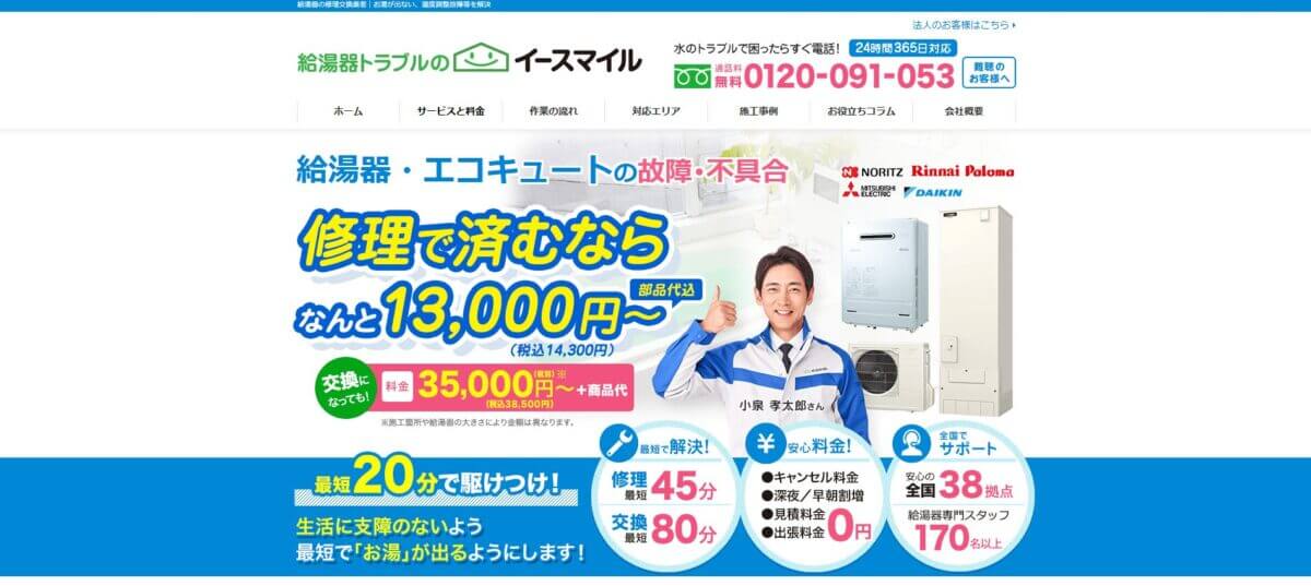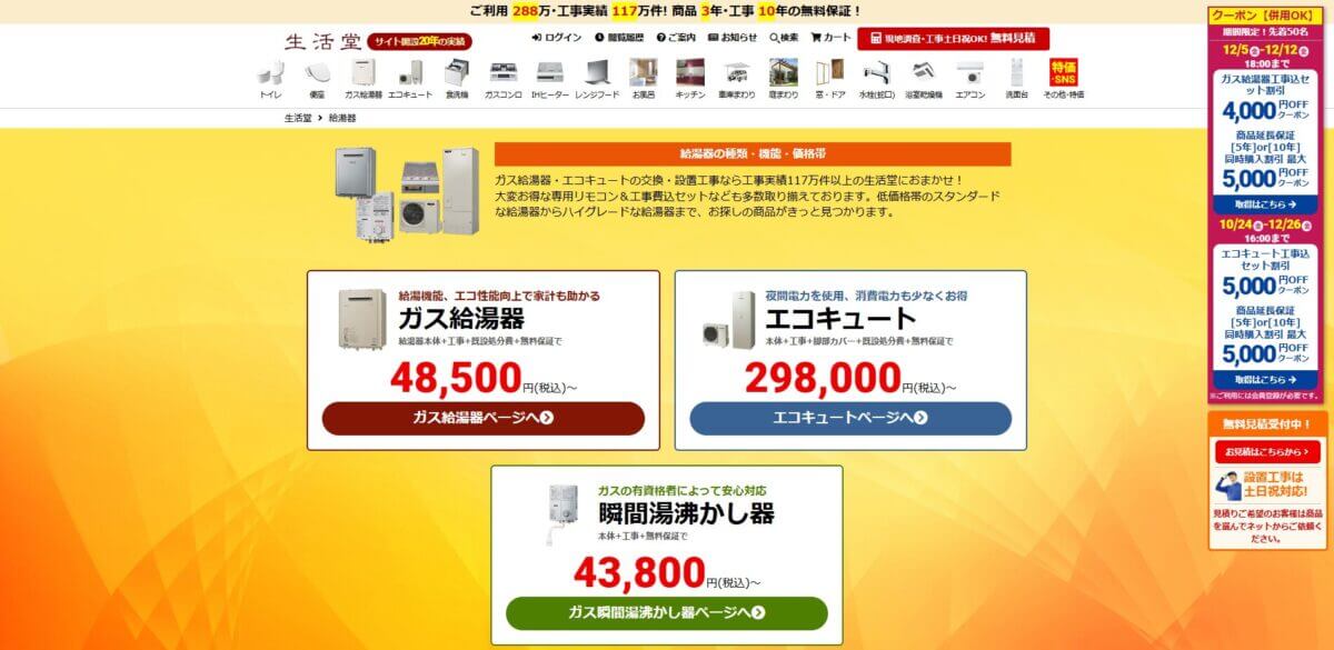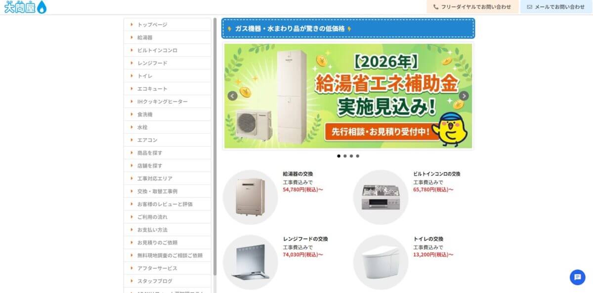 | 取扱メーカー | 給湯器:ノーリツ、リンナイ、パロマ、パーパス、TOTO、東芝、ハーマン、コロナ、長府製作所 エコキュート:三菱、ダイキン、日立、パナソニック、コロナ |