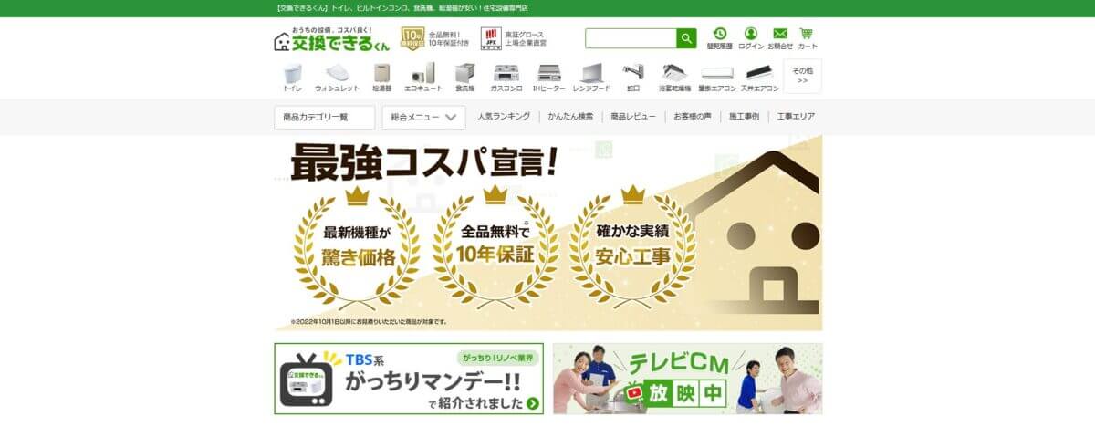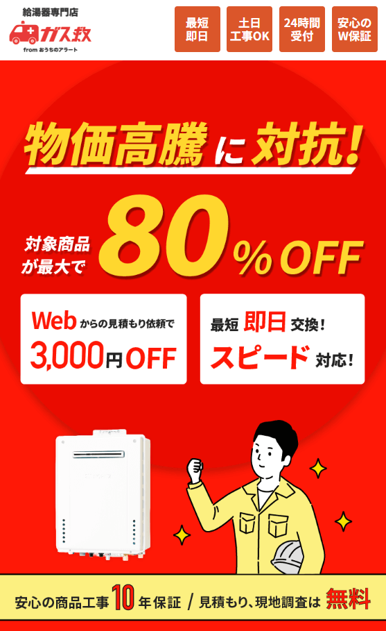 割引率も給湯器で最大80%、エコキュートで最大76%と比較的安く購入することが可能で、工事・商品の保証が無料で10年間ついてくるのは非常に魅力的です。