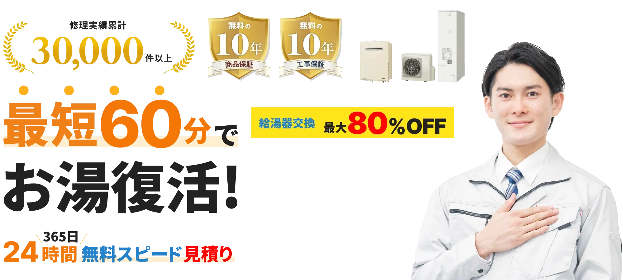 メーカーから商品を直接、大量に一括で仕入れるので、一般に出回っている価格より安価に手に入れられます。そのため、交換する給湯器の種類によっては最大80%オフと、破格の金額で提供できるのです。