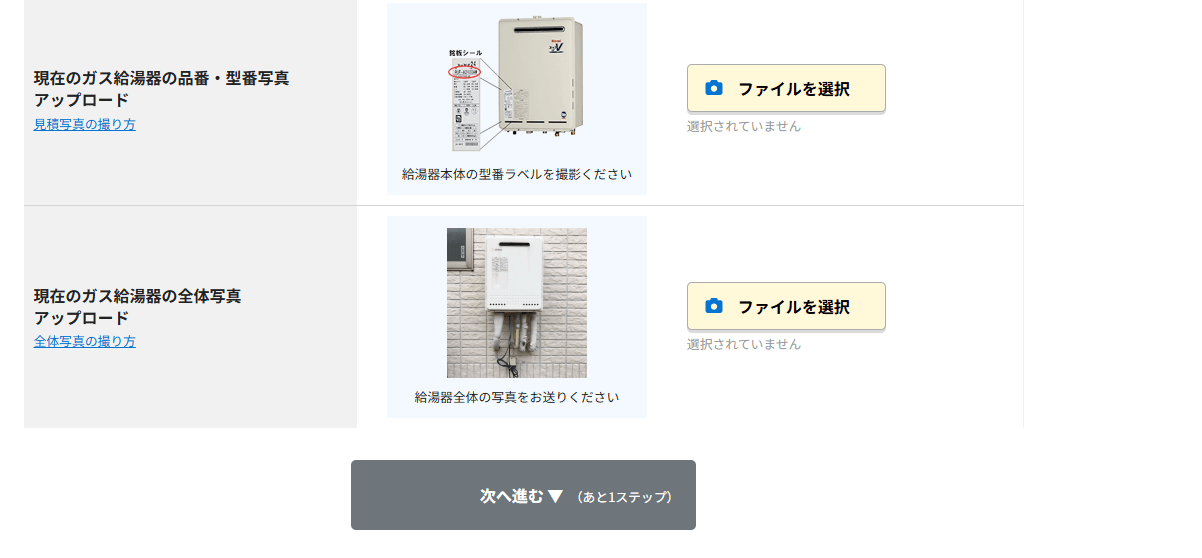 一番下に、現在使用している給湯器の写真を添付する欄が出てきます。確実な見積りをとるのであれば、可能な限り写真を添付するのをおすすめします。