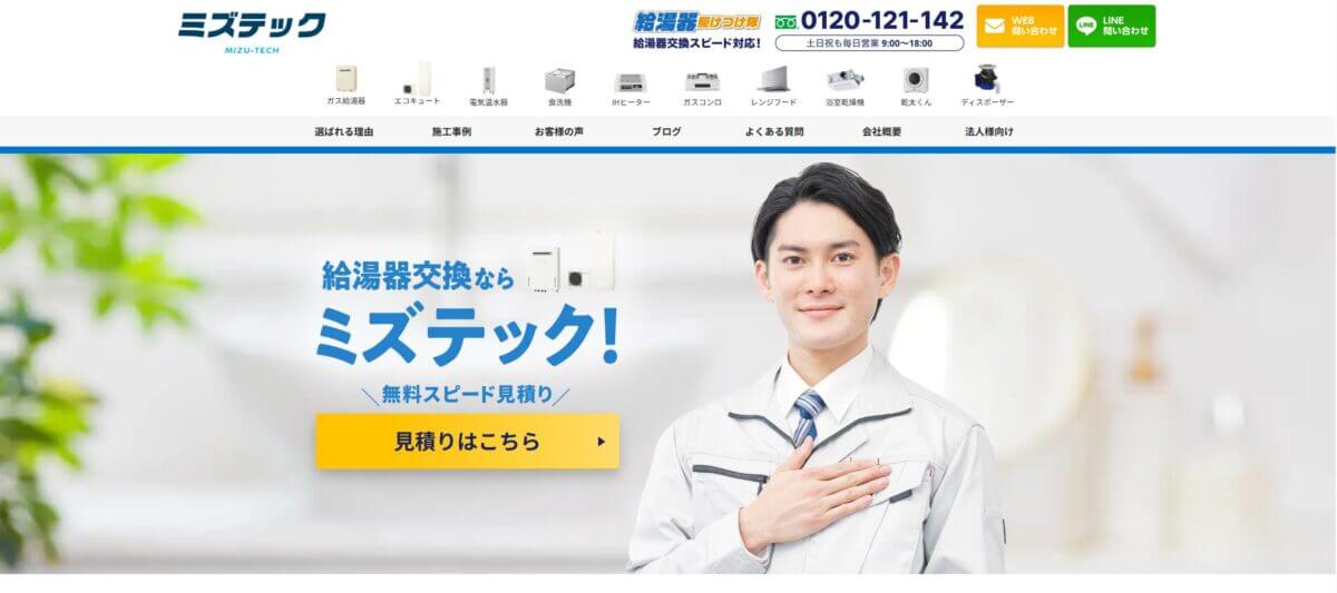 - ミズテックは給湯器の見積もりの割引率が良く、良心的な金額であり、商品と工事の10年保証がある