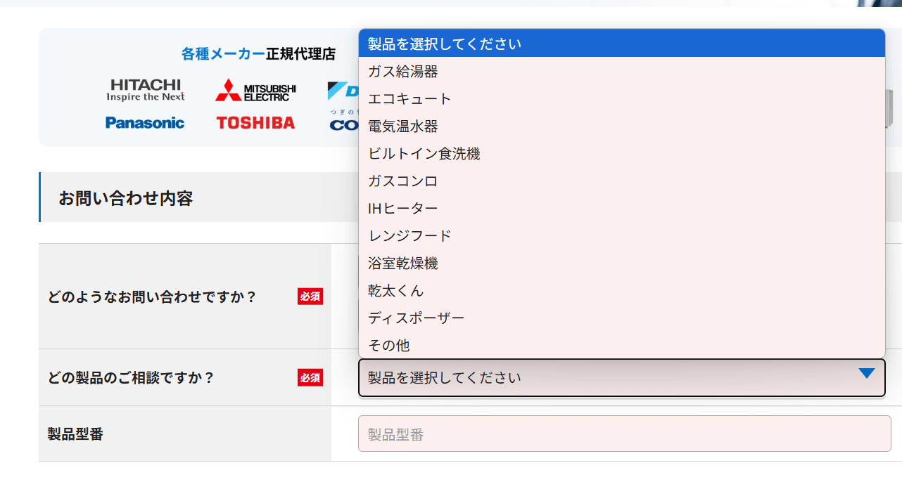 続いて、2行目は対象の製品を選ぶ項目があるので、給湯器の場合は一番上のガス給湯器を選んでください。
