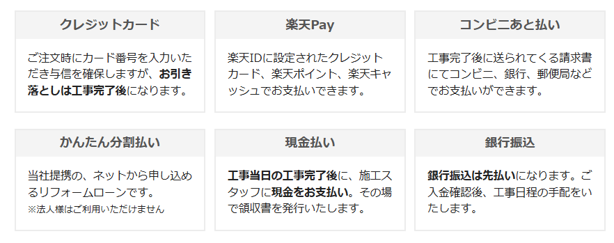 • 交換できるくん支払い方法は現金、クレジットカード、銀行振込、楽天Pay、コンビニあと払い、かんたん分割払い(リフォームローン)でのお支払いが可能