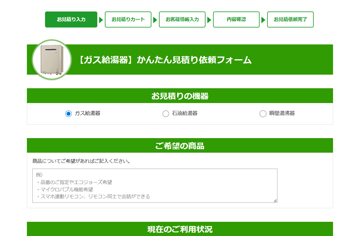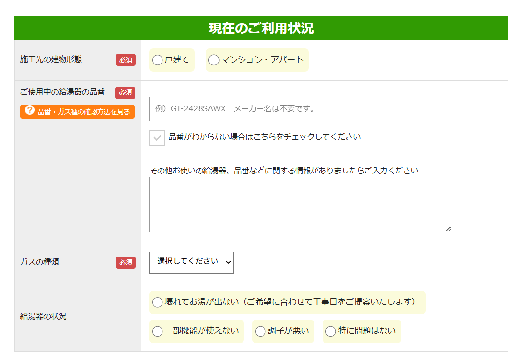 続いて、現在の利用状況を確認する項目があるので、施工先の建物形状の選択、使用中の給湯器の品番、ガスの種類の選択、給湯器の状況の入力を行います。