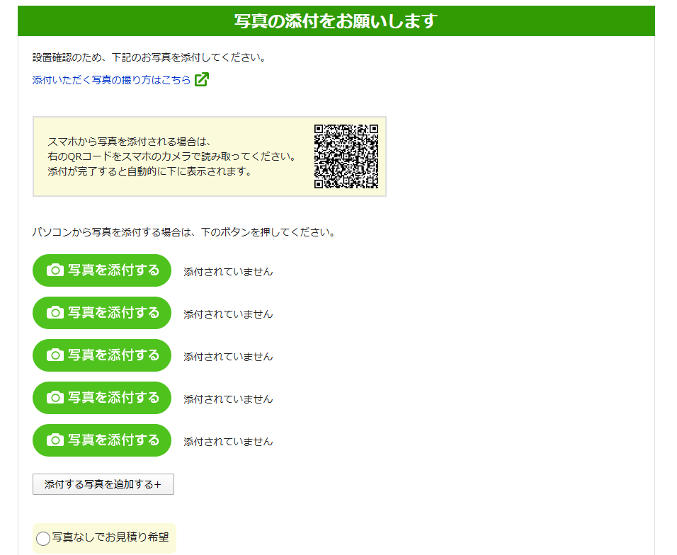次に、写真添付欄が出てくるので、現在使用中の給湯器までの搬入経路がわかる写真、設置されている周辺状況が分かる写真、配管部分の写真、リモコンの写真、浴室内の穴の写真など、写真の撮り方を参考にしながら添付写真を撮影し、添付します。