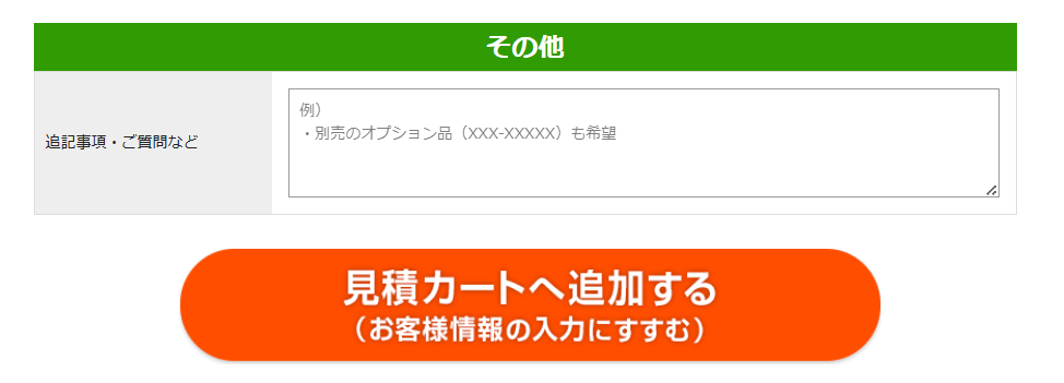 そのほか、別途伝えたいことがあればその他の欄に記入してください。すべて入力が完了したら、一番下のオレンジのボタン「見積カートへ追加する」を押してください。