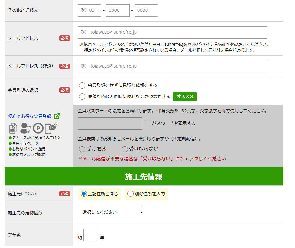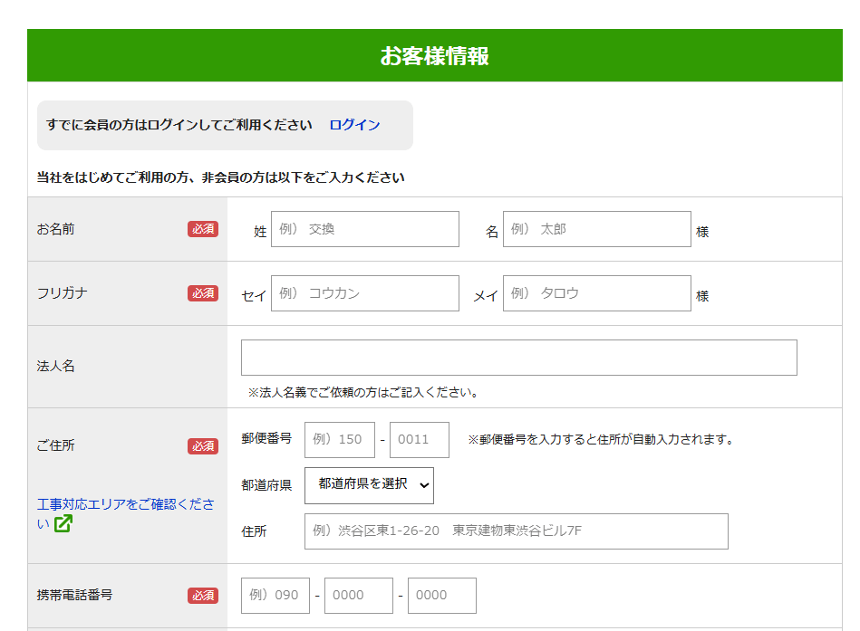 「お客様情報の入力にすすむ」を押すと、個人情報入力欄が出てくるので、順番に入力をしていきます。名前、フリガナ、住所、携帯電話番号、メールアドレス、会員登録の有無、施工先と住所が違う場合は施工先の住所の入力を行います。