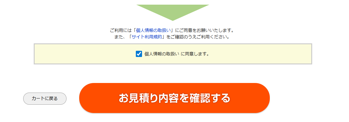 すべての入力が出来たら、個人情報の取扱いに同意します。の左のチェックボックスをクリックし、一番下のオレンジのボタン「お見積り内容を確認する」をクリックします。