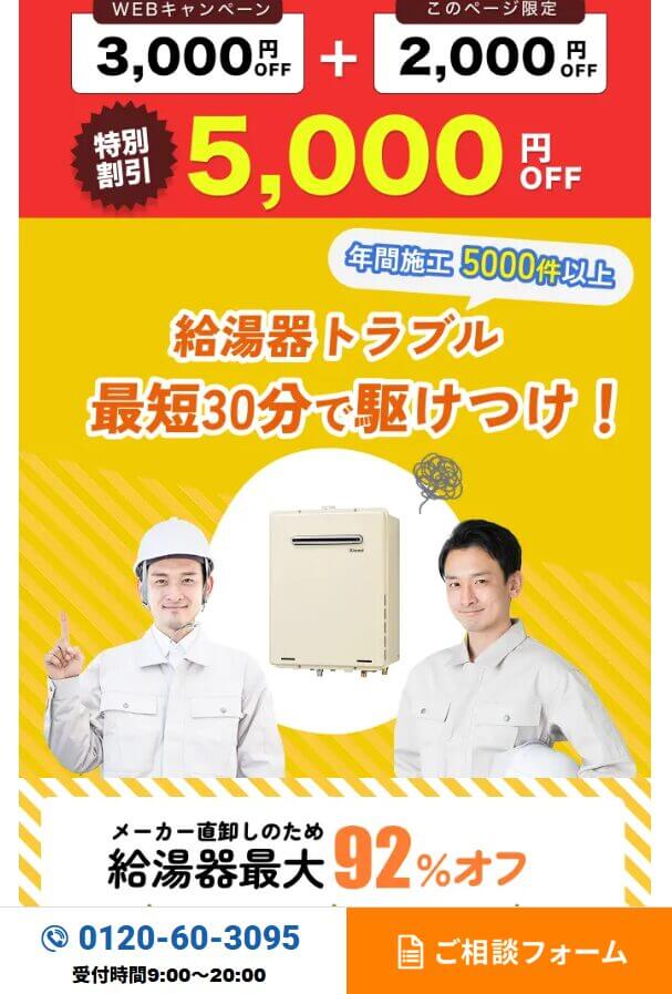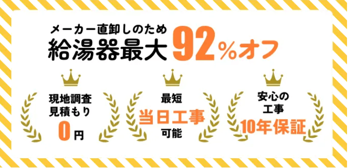 ①メーカー直卸しで給湯器を最大92%オフで提供