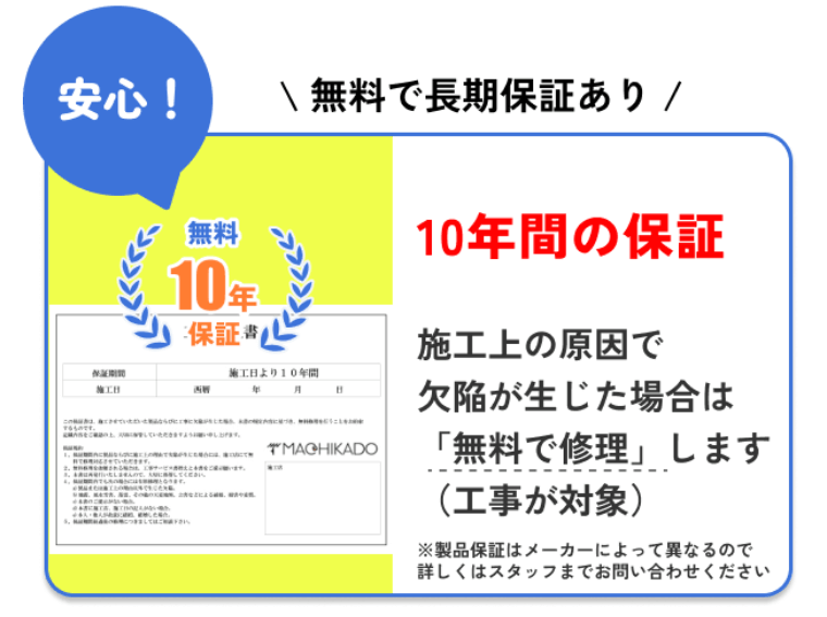 - 全ての工事に10年保証がつく!万一の不具合に長期的に備えられるので非常に安心です。