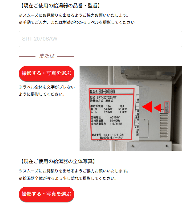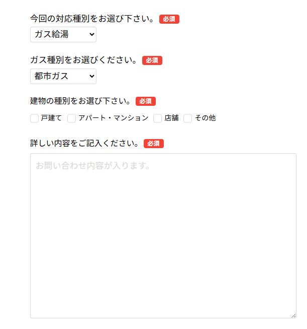 給湯器の情報、給湯器を設置している箇所の情報、相談内容を入力します。