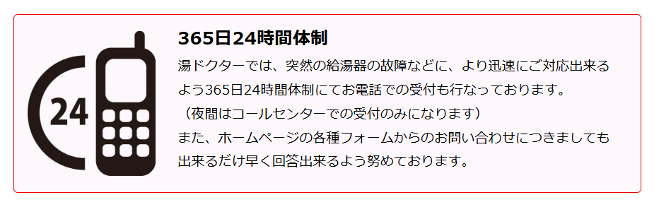 24時間365日、年中無休で受付してくれるため、休日や夜間など他店では対応が難しいタイミングで突然、給湯器が故障した場合も安心して問い合わせられます。