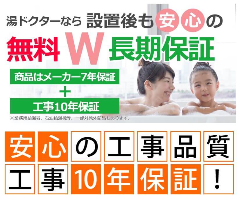 特に商品の保証は、湯ドクター独自の保証ではなく、給湯器メーカーの延長保証なので、万が一、湯ドクターが廃業などをした場合でも保証は継続します。