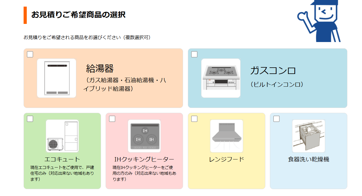 続いて、見積り希望の商品を選びます。給湯器を希望の場合は左斜め上のオレンジのボタン「給湯器」をクリックします。