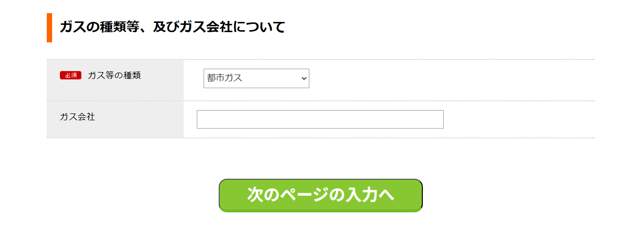 最後に使用しているガスの種類とガス会社の入力をして、一番下の緑ボタン「次のページの入力へ」をクリックします。