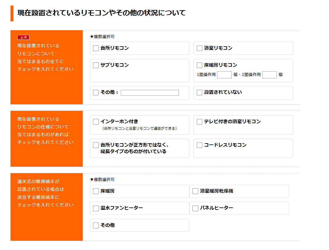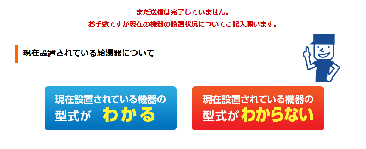 次のページへ進むと、現在使用中の給湯器の型式が分かるかどうかを選べます。どちらの場合も入力項目は同じですが、必須入力項目が違うので状況に合わせて選んでください。