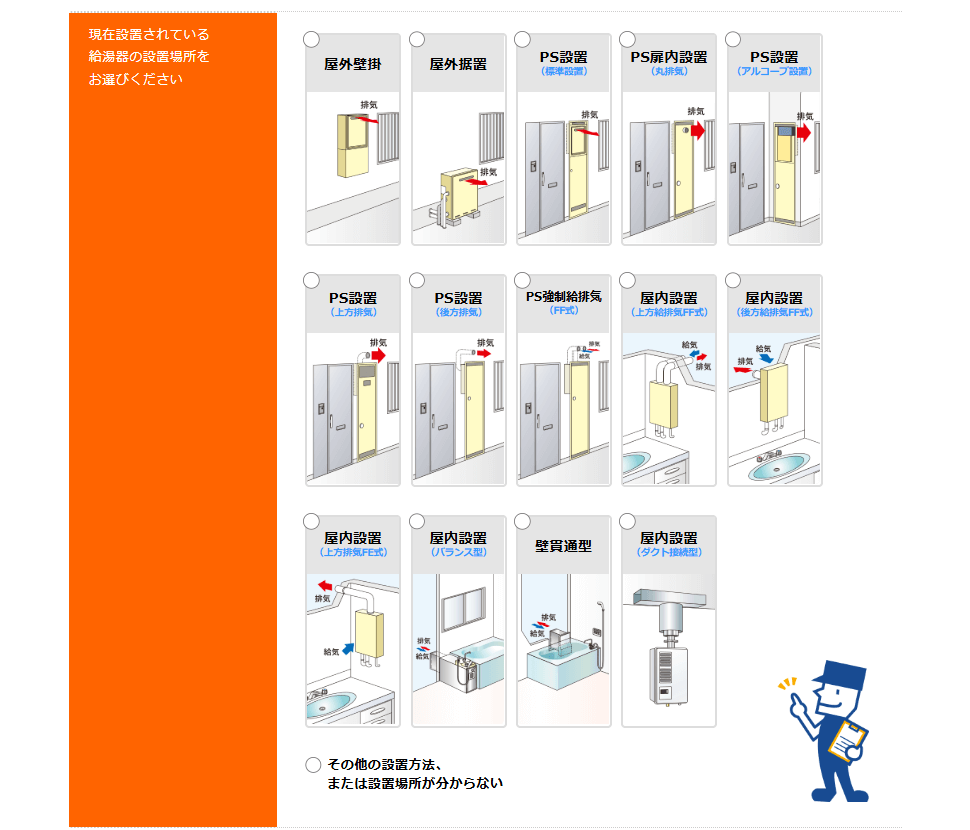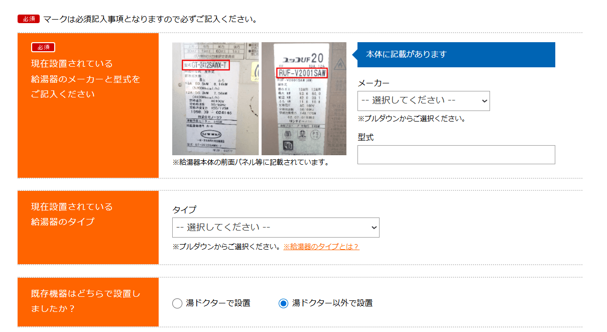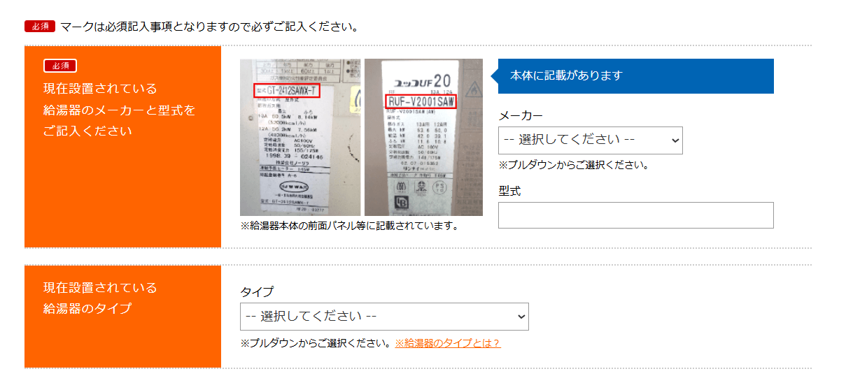 次のページへ進むと、給湯器情報を入力できる画面になるので、上から順に給湯器のメーカー型式、給湯器のタイプ、設置場所、前回施工業者の入力を行います。