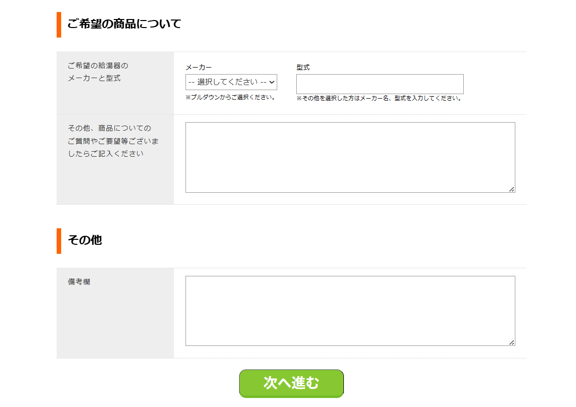 続いて、希望商品や要望、質問を入力できる欄が表示されるので、必要に応じて記入してください。すべて記入が出来たら、一番下の緑ボタン「次へ進む」をクリックします。