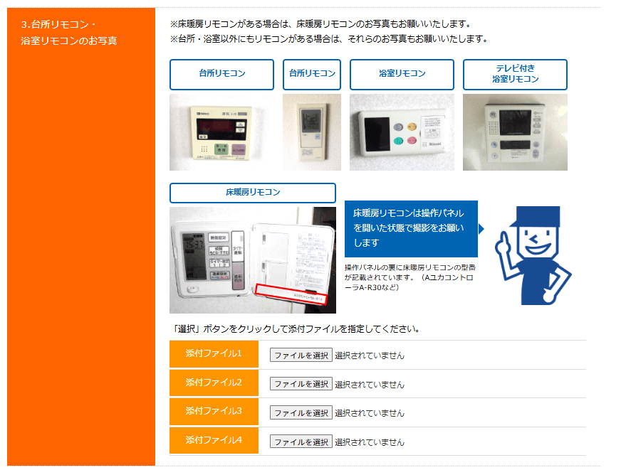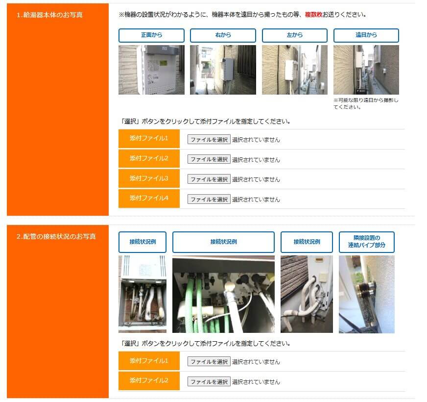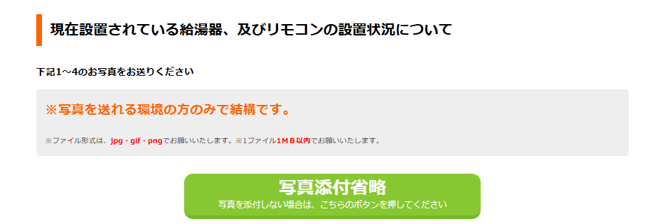 次に、現在使用中の給湯器や、周辺環境の写真の添付欄が表示されます。写真での見積りを希望の方以外であれば、写真の添付を省略することも可能です。