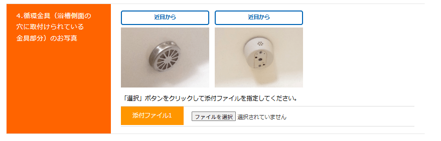 省略する場合は緑ボタン「写真添付省略」をクリックし、添付する場合は、給湯器本体、配管、リモコン、循環金具の写真を順に添付してください。