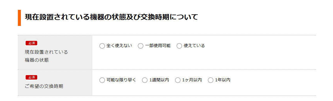 続いて、現在の給湯器の状況と交換希望時期を選択します。