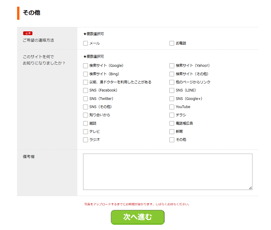 最後に、連絡方法の希望と、その他伝えたいことを入力し、すべて記入が出来たら、一番下の緑ボタン「次へ進む」をクリックします。